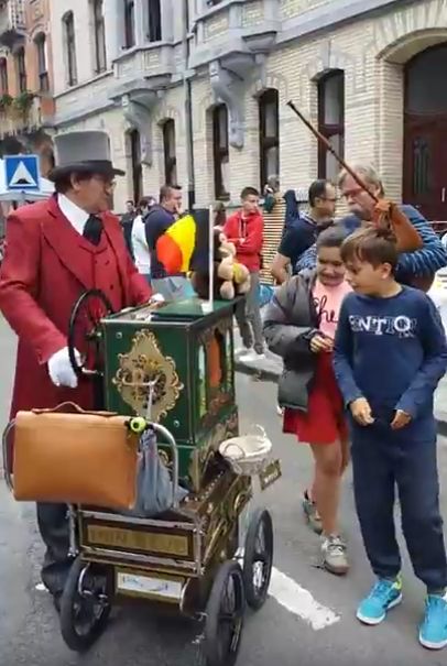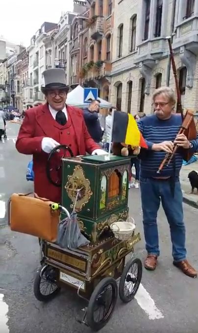 Les photos montre Louis Weiss qui autrefois passait de temps en temps dans ma rue à Schaerbeek (Bruxelles), et comme pour tout musicien de rue (non-amplifié) je donnais volontier une pièce quand sa mélodie résonnait les dimanches matins calmes. Finalement, un jour j'ai osé lui demander s'il était prêt à poser pour une photo. Et j'ai même essayé de jouer avec lui. Pas évident: son orgue est accordé en mi majeur (enfin à peu près) et j'ai vite débrayé les bourdons de ma veille en sol en essayant de le suivre sur mes chanterelles, alors que lui s'amusait en voyant mes contorsions de doigté et se demandant à quoi servent toutes ces touches....