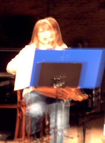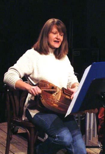 | Contexte: Le concert d'Ars Musica du 20 mars au Grand Hornu a présenté sous la direction de Jonathan Stockhammer des oeuvres de Jean Luc Fafchamps, Rebecca Saunders et James Dillon. De ce dernier, l'oeuvre intitulé "L'Evolution du vol" pour soprano, keyboards, clarinette, basse et 2 percussions comprend une partie pour soprano, clarinette et vielle à roue - instrument qui normalement ne fait pas partie de la panoplie d'Ars Musica. Ars Musica et Champ d'Action se sont pour l'occasion adressés à la classe de vielle à roue de Bruxelles. Ruprecht Niepold qui dirige cette classe a mis à disposition un instrument et a donné une formation de fortune à la soprona Ingrid Attrot en charge de jouer l'instrument pendant la prestation. Cette coopération entre la classe de vielle et Ars Musica va dans le sens de la classe de vielle à roue qui suit une approche de l'instrument sans préjugés culturels ("folk", "Auvergne", "Moyen Age" etc.) et au contraire enseigne la pratique de la vielle à roue comme instrument "complet" capable de contribuer avec sa spécificité à des genres musicaux très divers. instumentistes sur les photos:  crédit photos: Ruprecht Niepold |  |