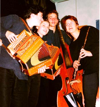 L'idée de créer Noctambules naît, quand trois des quatres musiciens se rencontrent à un stage d'improvisation. Car malgré la diversitée de leurs formations, les musiciens de cette formation sont réunis par une même recherche, qui marie une musique issue d'un répertoire traditionnel (Europe Centrale et Europe de l'Est) avec des harmonies, des rythmes et des sonorités jazz". Severine Lebrun (flûte traversière), née en 1975 (France) commence la flûte piccolo a l'age de 9 ans et suit les cours à l'Académie de Caen, où elle obtient deux premiers prix en flûte traversière et en musique de chambre (1993 et 1995). En 1997 elle obtient le premier prix de flûte de l'ENM de Bourg-la-reine. Depuis 5 ans elle fait partie de diverses formations comme "Salade de bruits" ou "Zikfa". Anne Niepold (accordéon diatonique), née en 1982 (Karlsruhe, Allemagne), commence le piano en 1989, mais choisie l'accordéon diatonique comme instrument fin 1995. Après avoir participée a diverses stages (Académie d'été a Neufchateau, Borzee, Dives sur mer ), elle se produit avec le duo "quatr' cafés", et le quintet "Les Plantations". Fin 1998 elle crée le duo "Deux accords diront" avec Aline Pohl. Aline Pohl (accordéon diatonique), née en 1974 (Ixelles, Belgique), participe depuis 1985 à des stages de danses es musiques traditionnelles. A l'Académie, elle suit des cours de piano et de solfège (prix de solfège à Bruges en 1988, prix de piano à Etterbeek en 1992), en 1997 elle débute en contrebasse classique et jazz. Actuellement elle poursuit sa formation en musique contemporaine à l'Académie d'Auderghem. Julien Costé (contrebasse), né en
