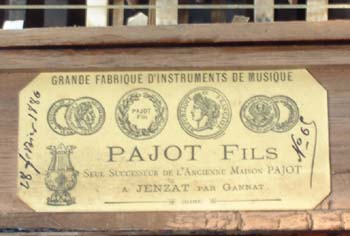Cette vielle porte le numéro 69 et est datée du 28 février 1886, c'est à dire à l'apogée de la facture de vielle à Jenzat (6 marques de vielles). C'est aussi le début de la période faste de la maison Pajot marquée par Jean-Baptiste Pajot (1863-1935).