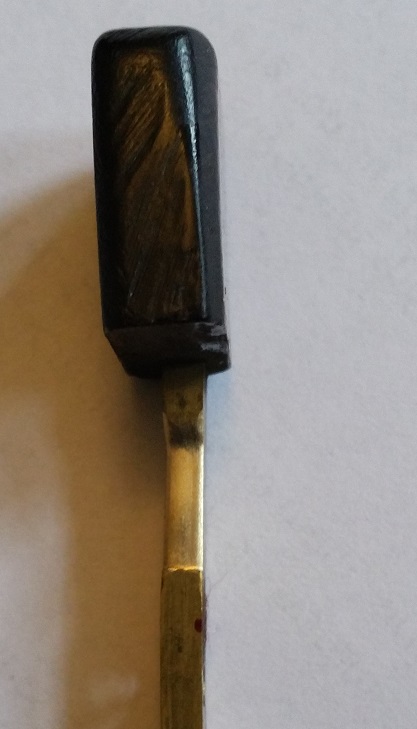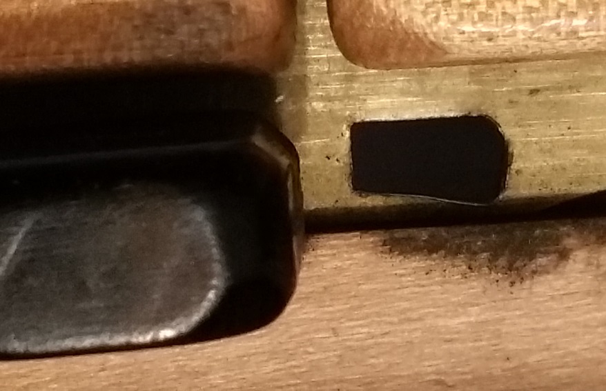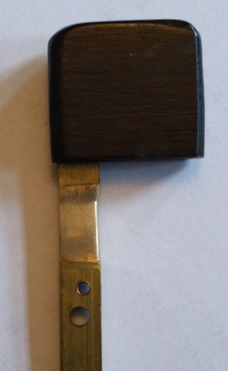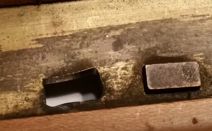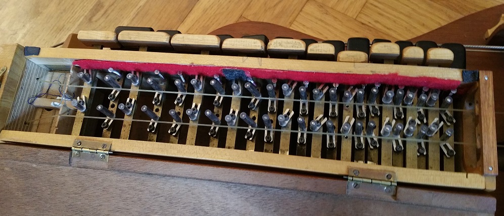 Les touches du clavier montrent un jeu extrême, car avec le tempos le frottement des tangentes en lation contre les parois de la boite à tangentes - également en laiton - a aggrandi les trous d'ouverture et arrondi le profil des tangentes là où elles passent par les ouvertures. Ceci est plus particulièremt prononcé pour les touches où le bout des touches est - par necssité de découpe des touches sur le clavier - fixé de façon asymétrique sur la tangente. Dans ces cas le poids de la touche exercer une force de rotation permanente sur la tangente qui donc à chaque utilisation de la touche induit une usure asymétique. Pour remedier à ce problème il faudrait refaire tout le clavier y compris la boite à tangente, ce qui qui est un investisement probablement sans rapport avec la valeur de l'instrument. Mais curieusement la justessse de la gamme est comparativement peu affectée par le jeu des touches, car en fin de compte actionner ces touches résulte toujours dans une position plus moins stable et reproduisible par rapport à laquelle on peut régler les sautereaux pour obtenir une note juste, alors que le jeu de la touche peut en principe faire varier le point d'appuie des sautereaux sur les chanterelles de + / - 5 mm !