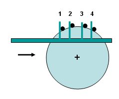 Ceci permet de résoudre un problème endémique des vielles à tangentes classiques. En effet l'action de la touche classique sur les chanterelles déplaçe inévitablement la corde par rapport au pourtour de la roue, ceci entraine un changement d'appuie de la corde sur la surface de la roue. Dans le schéma ci-dessous, les cordes 1 et 2 sont poussées vers la roue, alorsque les cordes 3 et 4 auront tendance à s'éloigner de la surface de la roue. Dans les deux cas le son s'en trouve légèrement altéré, et le phénomène est d'autant plus sévère qu'il y a de chanterelles car elles seront inévitablement être placées de plus en plus d'un côté et de l'autre du point culminant de la roue. Donc l'angle que forme la tangente par rapport à la tangente géométrique de la roue passant par le point d'appui de la corde augmentera plus la corde se trouve à l'extérieur. Ceci explique pourquoi des vielles à tangentes classiques ne comportent pas plus de 3 chanterelles, maximum 4.