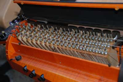La roue en contreplaqué brut, à l'avant plan le bloc des capteurs des bourdons, en haut: les capteurs (fixés au couvercle couvrant le mécanisme des tangentes) pour ;es chanterelles: