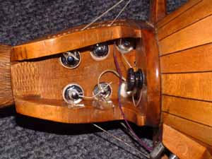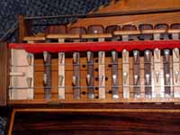 Dernière nouvelle: Cette vielle à été entièrement restaurée en 2001 par le luthier Christian Clément de Paris: chevilles démultipliées (mécanismes cachés dans le bloc à chevilles - voir en bas), sautereaux fixés par des vis (voir en bas), réhaussement du chevalet des chanterelles et diverses réparations comme le colmatage de fentes dans le corps et dans la table, reconstruction du bloc de chevilles pour les chanterelles etc. En plus, l'accord est maintenant en bourbonnaise (ré sol). Le résultat est un son particulièrement puissant et une riche sonorité pour de cette vielle de petite taille . Ecoutez plutôt ! (fichier MP3, 300k). (Donc: le cerisier est mort, mais la vielle est bien vivante!).