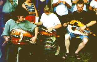 | Parmi les instruments à bourdons figurent la cornemuse (bourdon réalisé par un ou plusieurs tuyaux à longueur fixe et un tuyau à trous, le chalumeau ou chanter, pour la mélodie), la vielle (bourdon réalisé par une ou plusieurs cordes de longueur constante ainsi qu'un clavier agissant sur une corde pour la melodie). De nombreux instruments emploient des effets de bourdon, p.e. le psaltérion ou chaque corde frottée par l'archet résonne très longtemps et interfère avec les notes environnantes. | |