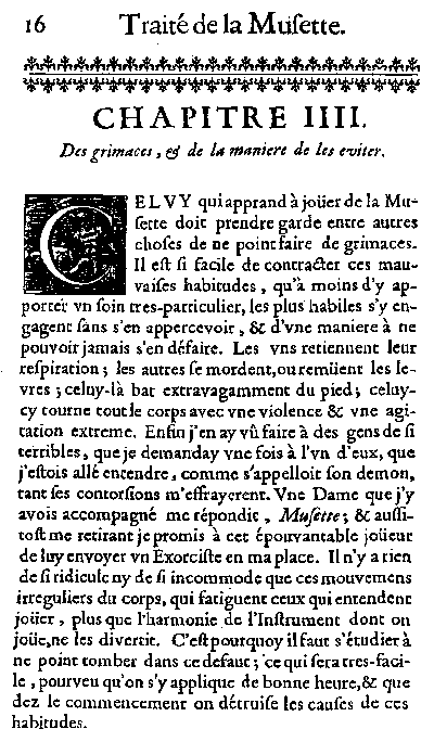 (et cornemuseux d'ailleurs) de tirer des grimaces en jouant... Suit une analyse détaillée des causes possibles de ce mal et de ses effets (notamment sur la concentration à correctement intoner ce qui devient en effet extrêment difficile si l'on bouge). L'auteur recommende entre autre de jouer devant une glace (sans doute pour être épouvanté de son propre spectacle car l'auteur précise que cette méthode est plus efficace que tout raisonnement) ou d'avoir recourt à la "méthode des anciens" (Marsyas) qui "attachaient à la tête un espèce de lien en cuir" empêchant les lèvres de se tordre... Avis aux amateurs ! |