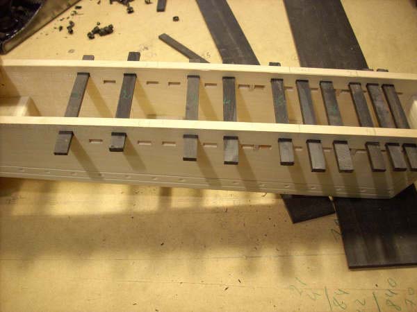Des lames d'os sont découpées et les trous correspondants aux mortaises des tangentes repérés et percés. Ensuite, les lames d'os seront coupées selon la longueur des embouts des différentes touches.