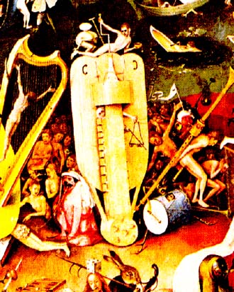 La vielle fut bannie des églises, peut être parce que le son détournait trop l'attention des fidèles. Elle est représentée ici comme instrument de la débauche.