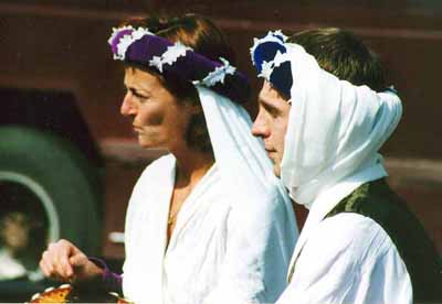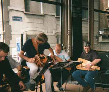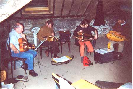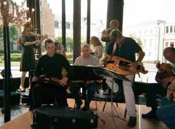<----> Certains élèves s'organisent pour des prestations, comme ici: Soutient musical à une pièce de théâtre ... (Festival des Fleurs, Boisforts (Bruxelles), juillet 2001) ![]() | ||